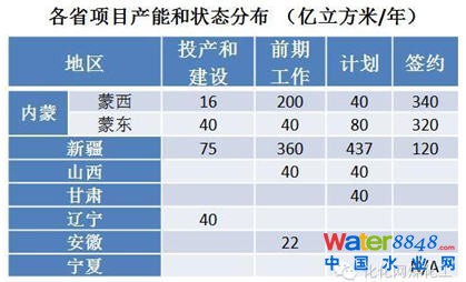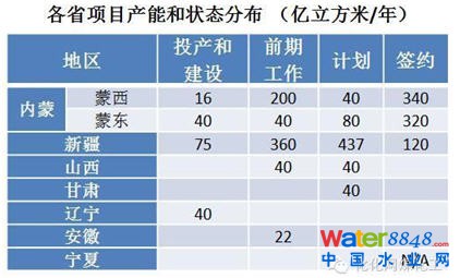 從項目的地理分布來看:全國計劃總產(chǎn)能2250億立方米/年中,內(nèi)蒙古分布產(chǎn)能1076億立方米,其中鄂爾多斯及周邊的蒙西地區(qū)占到596億,呼倫貝爾及周邊的蒙東地區(qū)占到480億立方米。新疆總計產(chǎn)能也達(dá)到992億立方米,其后是山西80億立方米,甘肅40億立方米,遼寧40億立方米,安徽22億立方米。