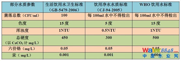 生活飲用水國(guó)標(biāo)、飲用凈水國(guó)標(biāo)以及WHO飲用水標(biāo)準(zhǔn)部分參數(shù)的對(duì)比,水質(zhì)檢測(cè)的指標(biāo)有百來(lái)項(xiàng),以上擇取了標(biāo)準(zhǔn)中存在差異的部分指標(biāo)。