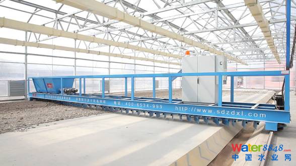 該工程由中大貝萊特壓濾機(jī)有限公司自主設(shè)計(jì),使用擁有自主知識(shí)產(chǎn)權(quán)的高效自動(dòng)隔膜壓濾機(jī),使污泥的含水率降至60%以下,再經(jīng)泥餅破碎機(jī)破碎后送至溫室棚,溫室棚采用太陽(yáng)能—水(地)源熱泵復(fù)合節(jié)能新技術(shù)設(shè)計(jì)制造,并配置了自動(dòng)污泥干化布料機(jī)和除臭設(shè)備,使污泥變?yōu)楹什怀^10%的無(wú)污染的干粉,達(dá)到了進(jìn)一步綜合利用的目的。