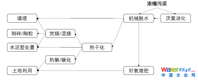 根據(jù)上述逆向設(shè)計思想,可以將污泥最終處置方式與前處理技術(shù)相結(jié)合,篩選出可用的處理技術(shù)路線。水分去除的常用方式包括機械脫水和熱干化,而有機質(zhì)去除或轉(zhuǎn)化的常用方式包括厭氧消化、熱化學(xué)處理(焚燒/混燒/熱解等)、堆肥等。這樣,污泥主要處理處置流程可以歸納為圖3。其中,污泥經(jīng)高干脫水后可以填埋,但僅適宜作為過渡和應(yīng)急方法。厭氧消化可以去除部分有機質(zhì),從而增加機械脫水過程中去除的水分總量,減少后續(xù)熱干化水分蒸發(fā)的能耗,因此厭氧消化+干化焚燒/熱解的方式在國外一些污水廠獲得了應(yīng)用,但這一方式的總體效果還需進一步評估。另外,雖然厭氧消化可以實現(xiàn)污泥穩(wěn)定化,但其穩(wěn)定化程度不如好氧堆肥,消化污泥一般要經(jīng)晾曬或短暫的好氧處理后才適宜土地施用。