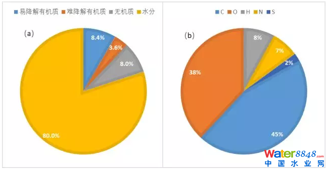 污泥常被認為擁有巨大的資源化潛力。然而,無論從產(chǎn)量還是品質(zhì)上,污泥資源化潛力遠不如生活垃圾、農(nóng)林廢棄物等大宗廢物。據(jù)國家統(tǒng)計局數(shù)據(jù),2016年,我國生活垃圾清運量達2.0億噸,而市政污泥產(chǎn)生量約4000萬噸(以80%含水率的脫水污泥計),扣除水分后,干固體僅800萬噸。我國污泥有機質(zhì)含量普遍偏低,一般為30~60%,這意味著前述干固體中還有大量缺乏資源化價值的無機質(zhì)。雖然這些無機質(zhì)可以用于制建材,但這種方式更適宜稱為廢棄物消納而非資源化利用。有機質(zhì)中,難以生物降解的木質(zhì)纖維素含量約14~30%,腐殖酸含量約10~15%,它們的存在進一步降低了污泥生物轉(zhuǎn)化能源的效率。以污泥有機質(zhì)含量60%為例,脫水污泥成分可以用圖1(a)概括。從污泥干固體元素組成看,其碳含量相遠低于生物質(zhì)廢物。根據(jù)對幾十座南方污水廠污泥性質(zhì)的調(diào)查,其平均元素組成如圖1(b)所示,其中碳元素作為多種資源化處理技術(shù)的利用對象,其比例僅45%。從污泥有機物組成看,蛋白質(zhì)是主要成分,但其含量不超過50%,其次是多糖、腐殖酸、脂類等。