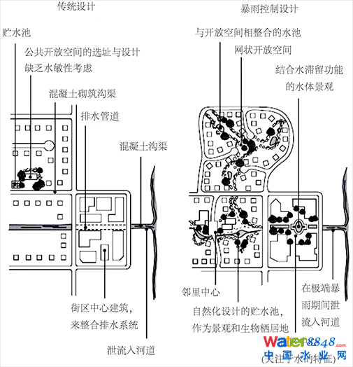 新型城市水循環(huán)的開(kāi)發(fā)思路給城市設(shè)計(jì)帶來(lái)了改變。以公共開(kāi)發(fā)空間為例,圖2比較了暴雨控制設(shè)計(jì)與傳統(tǒng)設(shè)計(jì)截然不同的設(shè)計(jì)思路。在傳統(tǒng)設(shè)計(jì)中,建筑是工整地排列,雨水和污水是通過(guò)集中官網(wǎng),收集處理。而在暴雨控制設(shè)計(jì)中,引入了與開(kāi)放空間相整合的水池,鄰里中心等多種景觀,水系環(huán)流整個(gè)街區(qū)。據(jù)此可以總結(jié)出暴雨控制設(shè)計(jì)的五個(gè)特點(diǎn) [16] :保證受納水體水質(zhì);減少?gòu)搅骱头逯盗髁,通過(guò)合理布置下滲池、透水鋪裝等措施降低下游流量峰值;保護(hù)天然水系,在城市發(fā)展過(guò)程中使其充分發(fā)揮作用;最小化排水設(shè)施的成本,在減少城市發(fā)展成本的同時(shí)增加效益,并使景觀得到改善,從而提升區(qū)域價(jià)值;將暴雨處理手段整合進(jìn)景觀,將雨水作為一種景觀要素。在暴雨控制設(shè)計(jì)中,水是關(guān)鍵,要綜合考慮水質(zhì)、水量、水系、水處理設(shè)計(jì)和親水景觀。