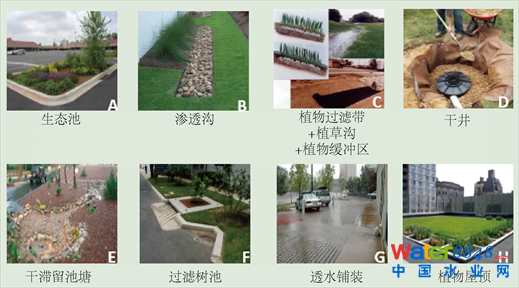 盡管不同國(guó)家都發(fā)展出各具特色的暴雨徑流控制體系,但其中的技術(shù)措施基本一致。本文具體以低影響開(kāi)發(fā)LID來(lái)闡述暴雨徑流的技術(shù)措施。LID以不增加城市基礎(chǔ)設(shè)施負(fù)擔(dān)為原則,通過(guò)分散的、小規(guī)模的源頭控制,綜合采用入滲、過(guò)濾、蒸發(fā)等方式減少?gòu)搅髋潘,減少下游排水管道的尺寸,恢復(fù)區(qū)域的自然水文功能,補(bǔ)充地下水 [11],圖3列出了常見(jiàn)的LID技術(shù)示范。
