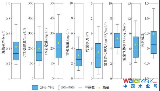 圖6給出了179座標(biāo)桿廠基于評(píng)估指體系的基本特征。可以看出,標(biāo)桿廠具有低噸水電耗、低污泥強(qiáng)度、低富營(yíng)養(yǎng)化潛力的特征。統(tǒng)計(jì)上,50%的標(biāo)桿廠噸水電耗為0.18~0.40 kW·h/m³,中位數(shù)比全國(guó)平均水平低22%;噸水污泥排放量為0.3~6.4 t/萬(wàn)m³,中位數(shù)比全國(guó)平均水平低36%;噸出水富營(yíng)養(yǎng)化潛力為2.8~5.6 mg PO43-.eq/L ,中位數(shù)比全國(guó)平均水平低19%。