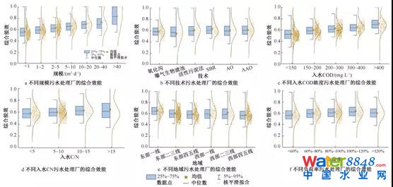 對(duì)于污水處理廠而言,綜合效能的差異既可能與其自身特征相關(guān),如地域、規(guī)模、技術(shù)、入水水質(zhì),也可能與人為管理相關(guān),如運(yùn)行負(fù)荷等相關(guān)。因此,本研究按照規(guī)模、技術(shù)、入水COD濃度、入水C/N、地域以及負(fù)荷率,對(duì)4 733座污水處理廠的綜合效能進(jìn)行了分組描述統(tǒng)計(jì),結(jié)果如圖8所示。