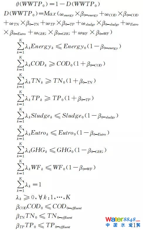 其中θ(WWTP0)為待評(píng)價(jià)污水處理廠WWTP0的綜合效能。D(WWTP0)為待評(píng)價(jià)污水處理廠WWTP0的最大化的綜合改進(jìn)潛力。ωenergy、ωCOD、ωTN、ωTP、ωsludge、ωEutro、ωGHG、ωWF 為能耗權(quán)重、COD去除量權(quán)重、TN去除量權(quán)重、TP去除量權(quán)重、污泥權(quán)重、富營(yíng)養(yǎng)化潛力權(quán)重、溫室氣體權(quán)重、灰水足跡權(quán)重,本研究分別取1/3, 1/9, 1/9, 1/9, 1/12, 1/12, 1/12, 1/12。β0-energy、β0-COD、β0-TN、β0-TP、β0-sludge、β0-Eutro、β0-GHG、β0-WF 為待評(píng)價(jià)污水處理廠WWTP0的能耗改進(jìn)潛力、COD去除量改進(jìn)潛力、TN去除量改進(jìn)潛力、TP去除量改進(jìn)潛力、污泥改進(jìn)潛力、富營(yíng)養(yǎng)化潛力改進(jìn)潛力、溫室氣體改進(jìn)潛力、灰水足跡改進(jìn)潛力;其中β0-energy、β0-sludge、β0-Eutro、β0-GHG、β0-WF取值范圍[0,1),β0-COD,β0-TN,β0-TP取值范圍[0,+∞)。K為待評(píng)估污水處理廠總數(shù)。λk為使得綜合改進(jìn)潛力最大化的污水處理廠線性組合最優(yōu)解中,第k個(gè)污水處理廠WWTPk的系數(shù),k=1,2,3,……,K。Energyk、CODk、TNk、TPk、Sludgek、Eutrok、GHGk、WFk為污水處理廠WWTPk的能耗、COD去除量、TN去除量、TP去除量、污泥、富營(yíng)養(yǎng)化潛力、溫室氣體、灰水足跡,k=1,2,3,……,K。Energy0、COD0、TN0、TP0、Sludge0、Eutro0、GHG0、WF0為待評(píng)價(jià)污水處理廠WWTP0的能耗、COD去除量、TN去除量、TP去除量、污泥、富營(yíng)養(yǎng)化潛力、溫室氣體、灰水足跡。COD0-effluent、TN0-effluent、TP0-effluent為待評(píng)價(jià)污水處理廠WWTP0出水中COD總量、TN總量、TP總量。