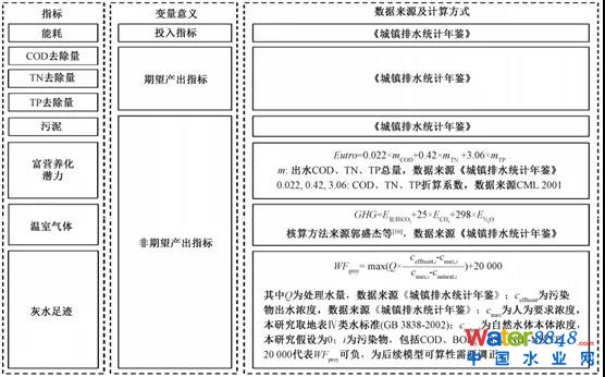 根據(jù)DEA方法的原理,本研究建立的污水處理廠綜合效能評(píng)估指標(biāo)體系包括投入類指標(biāo)、期望產(chǎn)出類指標(biāo)及非期望產(chǎn)出類指標(biāo)。具體各項(xiàng)指標(biāo)及計(jì)算方法如圖1所示。
