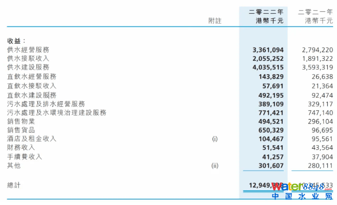 截止2022年12月31日,其營(yíng)業(yè)收入為129.50億港元(人民幣:111.23億元)同比上年的103.46億港元,增長(zhǎng)25.2%。其中,供水業(yè)務(wù)營(yíng)業(yè)收入87.14億元,占營(yíng)收比重為78.35%;污水處理業(yè)務(wù)營(yíng)業(yè)收入9.97億元,占營(yíng)收比重為8.96%;銷售物業(yè)業(yè)務(wù)營(yíng)業(yè)收入4.25億元,占營(yíng)收比重為3.82%。